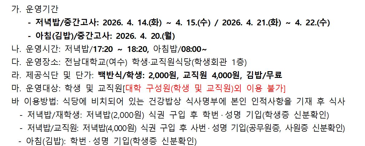 2026학년도 1학기 중간고사 '이천원의 저녁밥(건강밥상), 아침(김밥무료나눔)